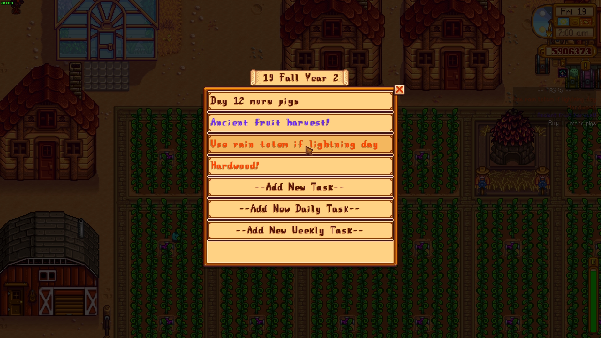 So onto the mod: a schedule planner! Far too many times I’ve forgotten to do something - tend to the greenhouse crops, build a new barn, give an item to one of the villagers, etc. So I made this mod to help keep track of everything. You open the calendar in-game and click on a date. Then, you can add a one-time task or a recurring daily or weekly task. On that date, whatever tasks you had set will show up below the clock.